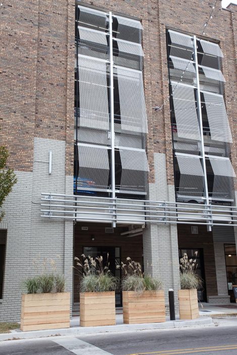 Exterior scope included custom perforated aluminum panels on steel outriggers, decorative lighting, storefront glass, and garage door installations; interior scope included metal stud and tenant separation walls and varied façade finishes.