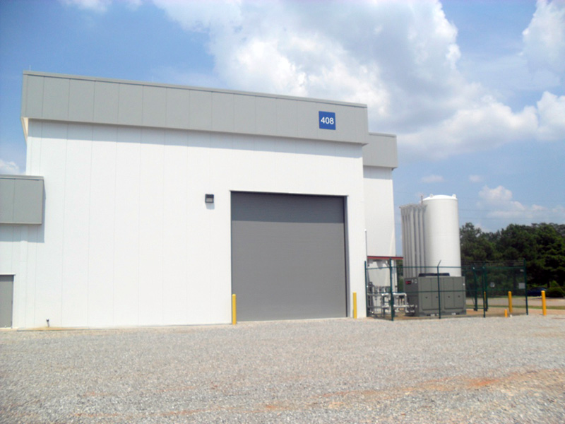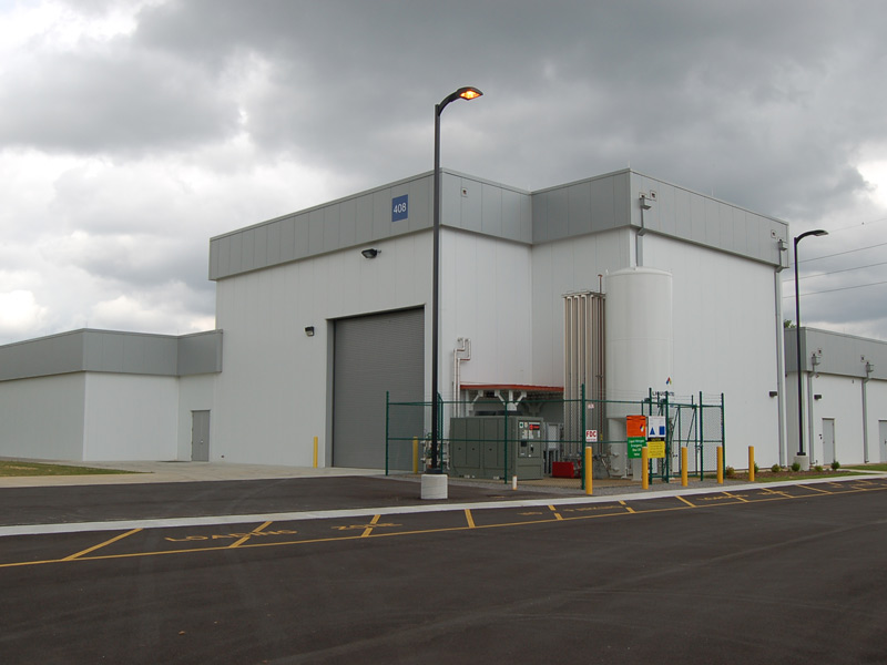 Work included the original high bay testing lab, a viewing theater addition, and complete Mechanical, Electrical, and Liquid Nitrogen systems; post-completion work added dedicated parking and a drive system.