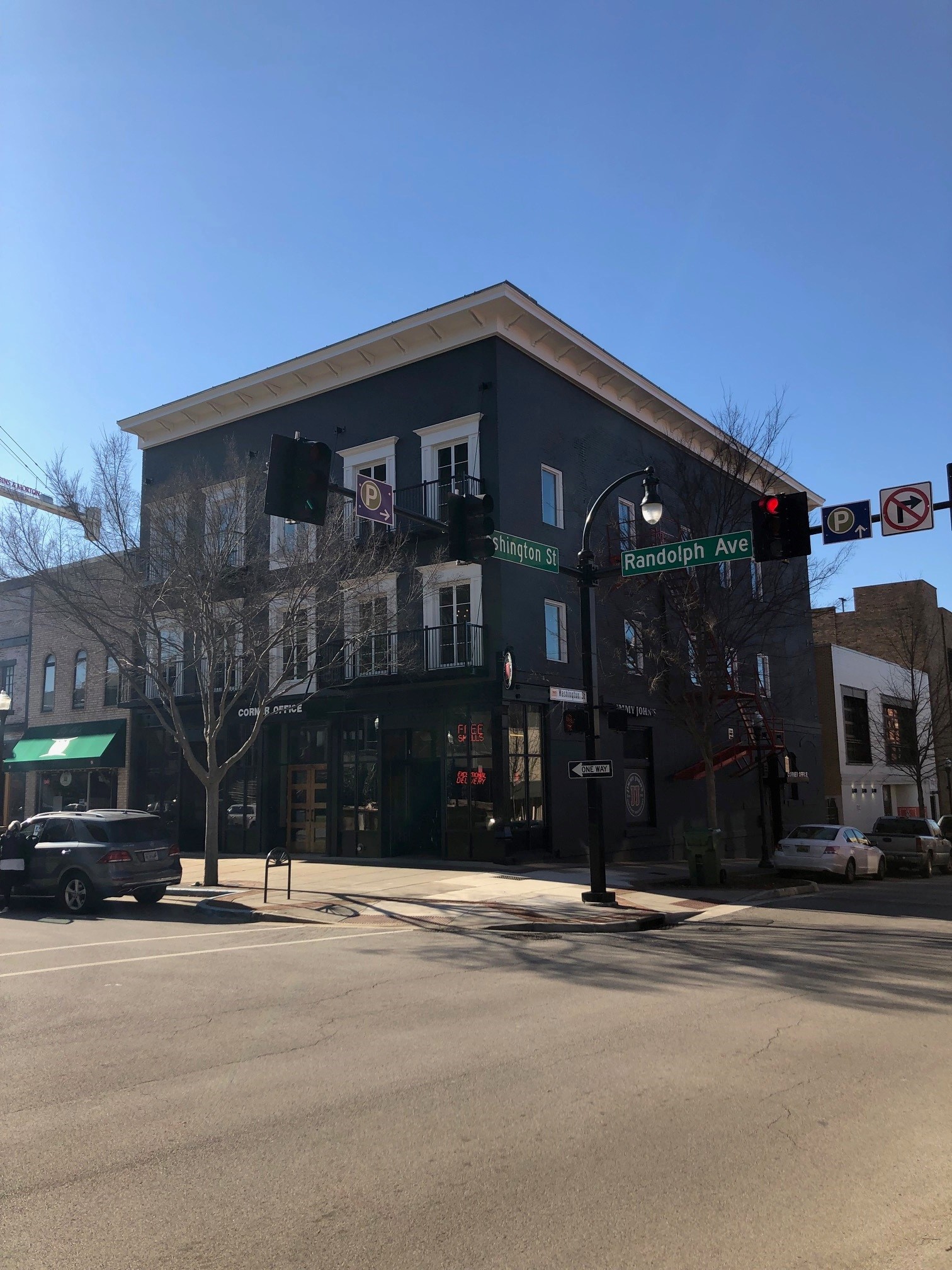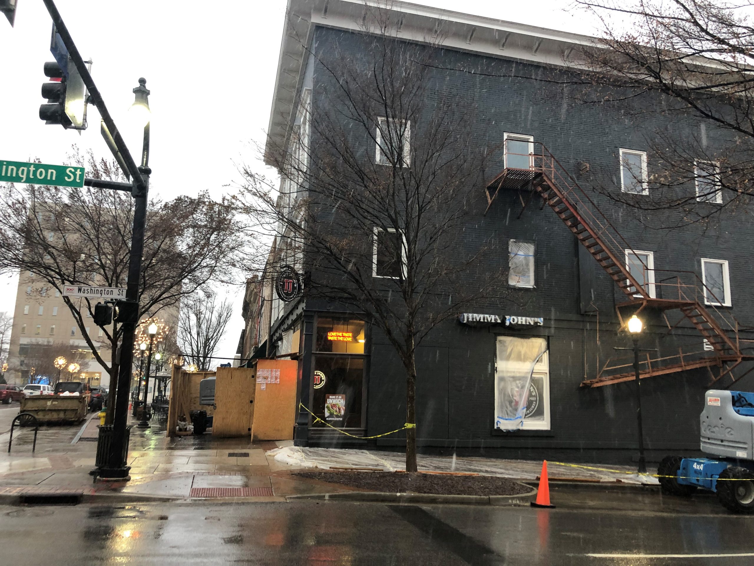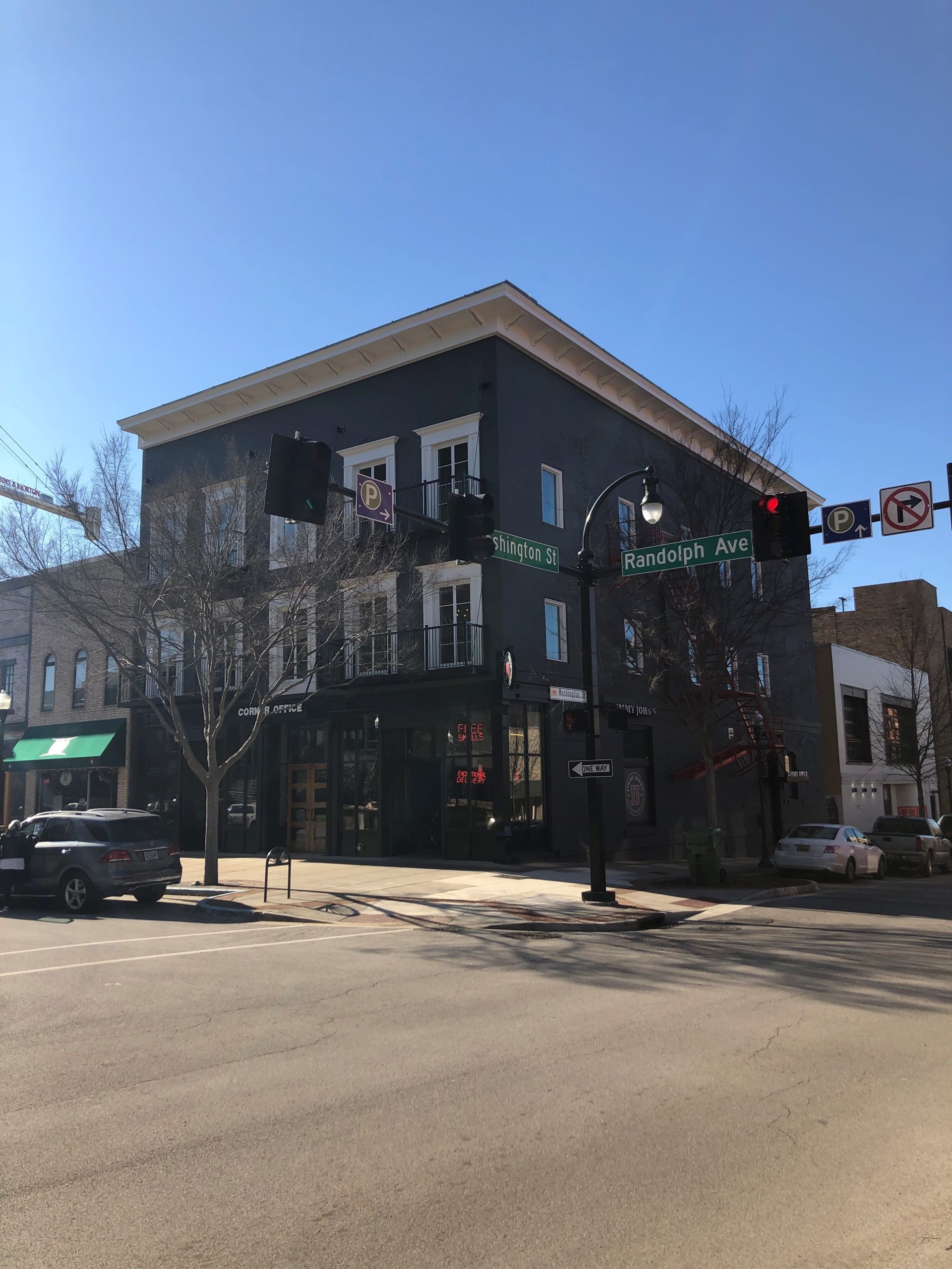 Located at the corner of Northside Square and Eastside Square, this three-story, 140-year-old building was in desperate need of a new start. JSBC was selected as a design-build partner to bring this old building back to life. A new entrance was needed between Jack Brown’s and Jimmy John’s to access the suites above the first floor, so the old center column was removed, and the entire front of the building was temporarily supported while two period columns from Texas were installed to bookend the new front entrance. Construction lasted approximately 10 months while the interior and exterior were completely refurbished.