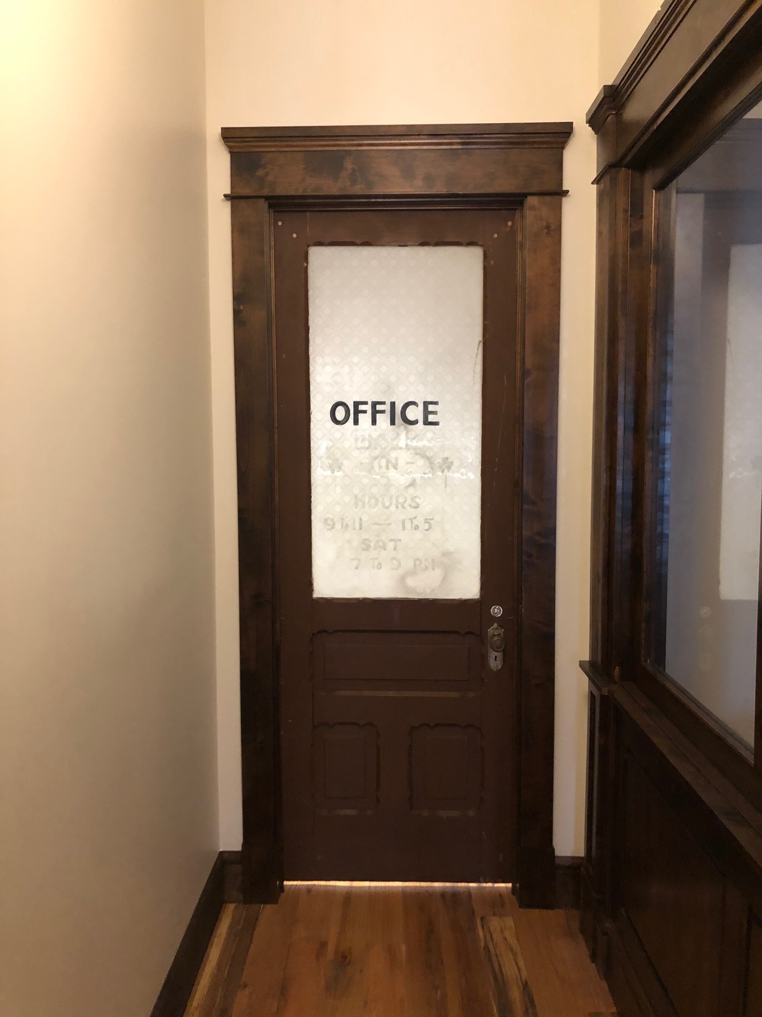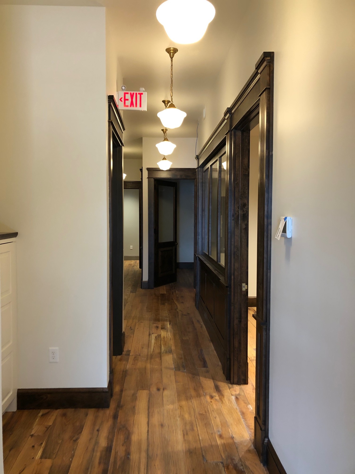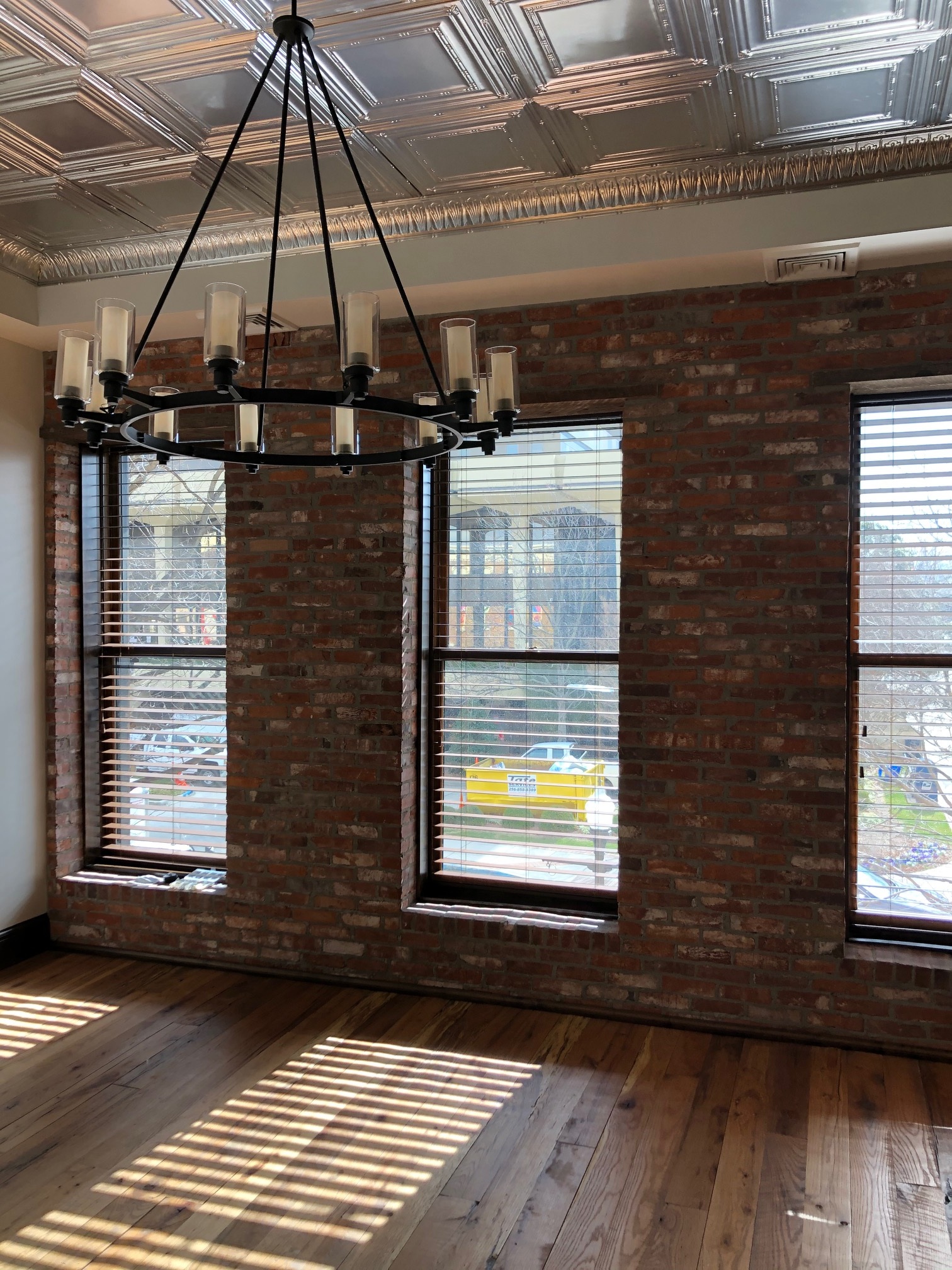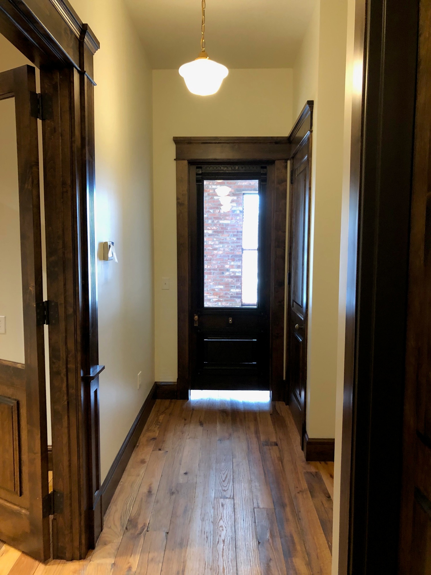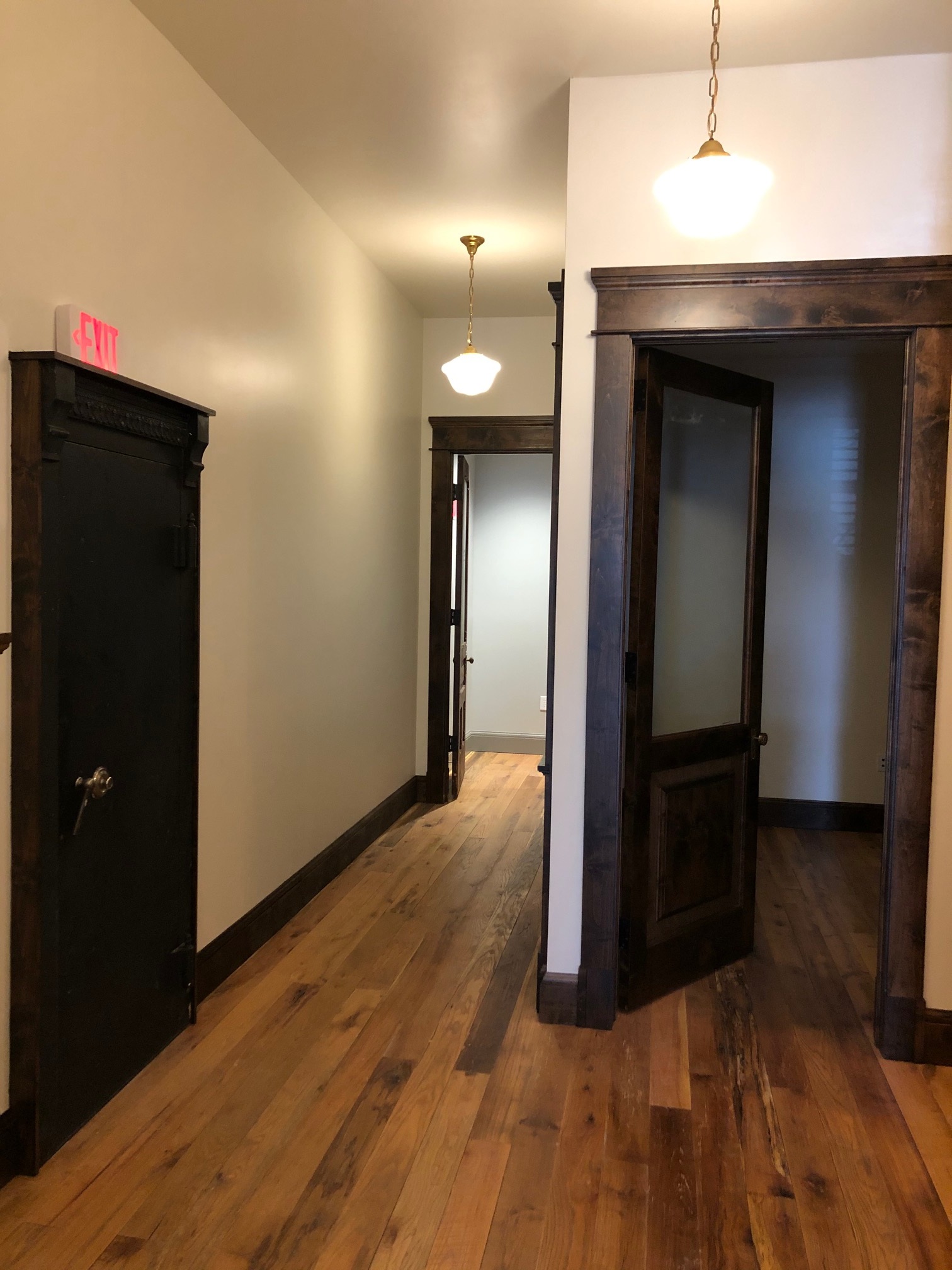 This renovation included leveling the floors and laying reclaimed oak flooring, and the addition of heavy trim, custom millwork, and tin ceilings.